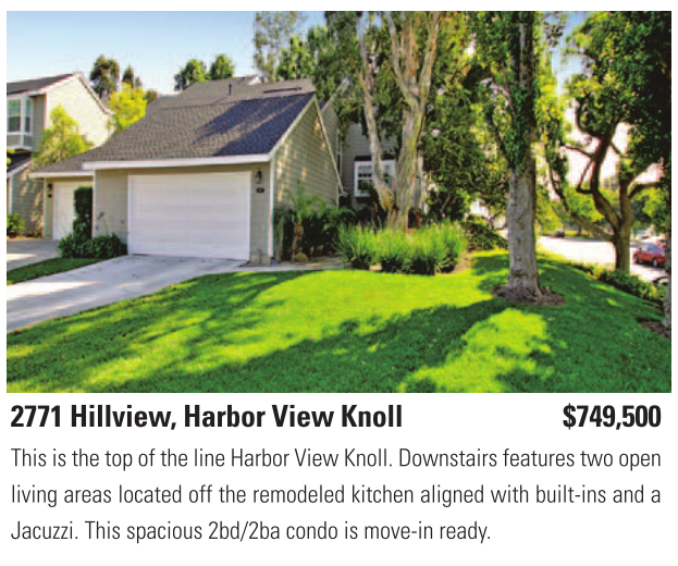 2771 Hillview, Harbor View Knoll $749,500 This is the top of the line Harbor View Knoll. Downstairs features two open living areas located off the remodeled kitchen aligned with built-ins and a Jacuzzi. This spacious 2bd/2ba condo is move-in ready.