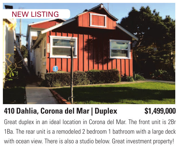 410 Dahlia, Corona del Mar | Duplex $1,499,000 Great duplex in an ideal location in Corona del Mar. The front unit is 2Br 1Ba. The rear unit is a remodeled 2 bedroom 1 bathroom with a large deck with ocean view. There is also a studio below. Great investment property!