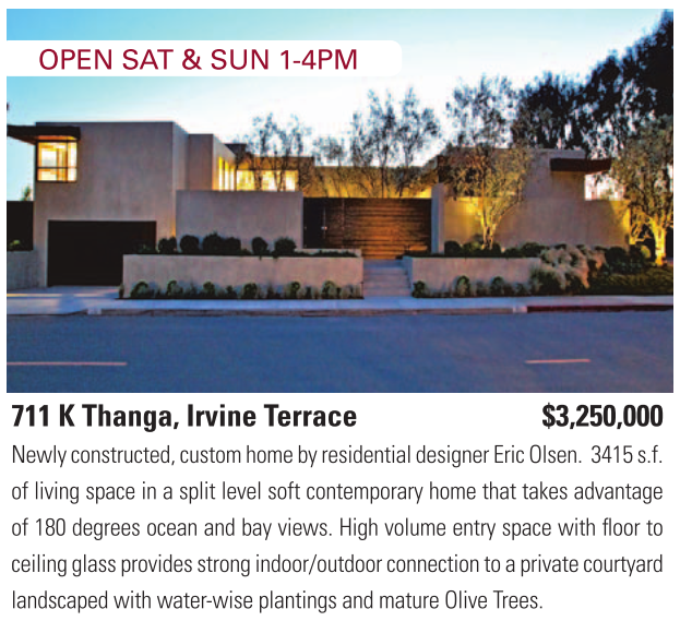 711 K Thanga, Irvine Terrace $3,250,000 Newly constructed, custom home by residential designer Eric Olsen. 3415 s.f. of living space in a split level soft contemporary home that takes advantage of 180 degrees ocean and bay views. High volume entry space with floor to ceiling glass provides strong indoor/outdoor connection to a private courtyard
