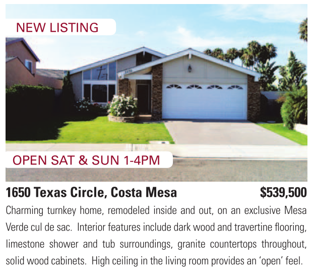 NEW LISTING OPEN SAT & SUN 1-4PM 1650 Texas Circle, Costa Mesa $539,500 Charming turnkey home, remodeled inside and out, on an exclusive Mesa Verde cul de sac. Interior features include dark wood and travertine flooring, limestone shower and tub surroundings, granite countertops throughout, solid wood cabinets. High ceiling in the living room provides an ‘open’ feel. See also