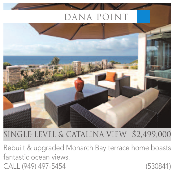 SINGLE-LEVEL & CATALINA VIEW $2,499,000 Rebuilt & upgraded Monarch Bay terrace home boasts fantastic ocean views. CALL (949) 497-5454 (530841)