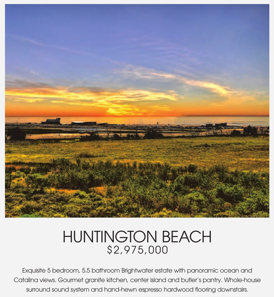 HUNTINGTON BEACH $2,975,000 Exquisite 5 bedroom, 5.5 bathroom Brightwater estate with panoramic ocean and Catalina views. Gourmet granite kitchen, center island and butler’s pantry. Whole-house surround sound system and hand-hewn espresso hardwood flooring downstairs. See also