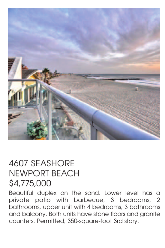 4607 SEASHORE NEWPORT BEACH $4,775,000 Beautiful duplex on the sand. Lower level has a private patio with barbecue, 3 bedrooms, 2 bathrooms, upper unit with 4 bedrooms, 3 bathrooms and balcony. Both units have stone floors and granite counters. Permitted, 350-square-foot 3rd story.