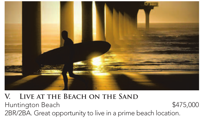 V. Live at the Beach on the Sand Huntington Beach $475,000 2BR/2BA. Great opportunity to live in a prime beach location.
