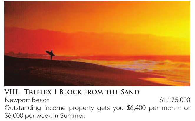 VIII. Triplex 1 Block from the Sand Newport Beach $1,175,000 Outstanding income property gets you $6,400 per month or $6,000 per week in Summer.