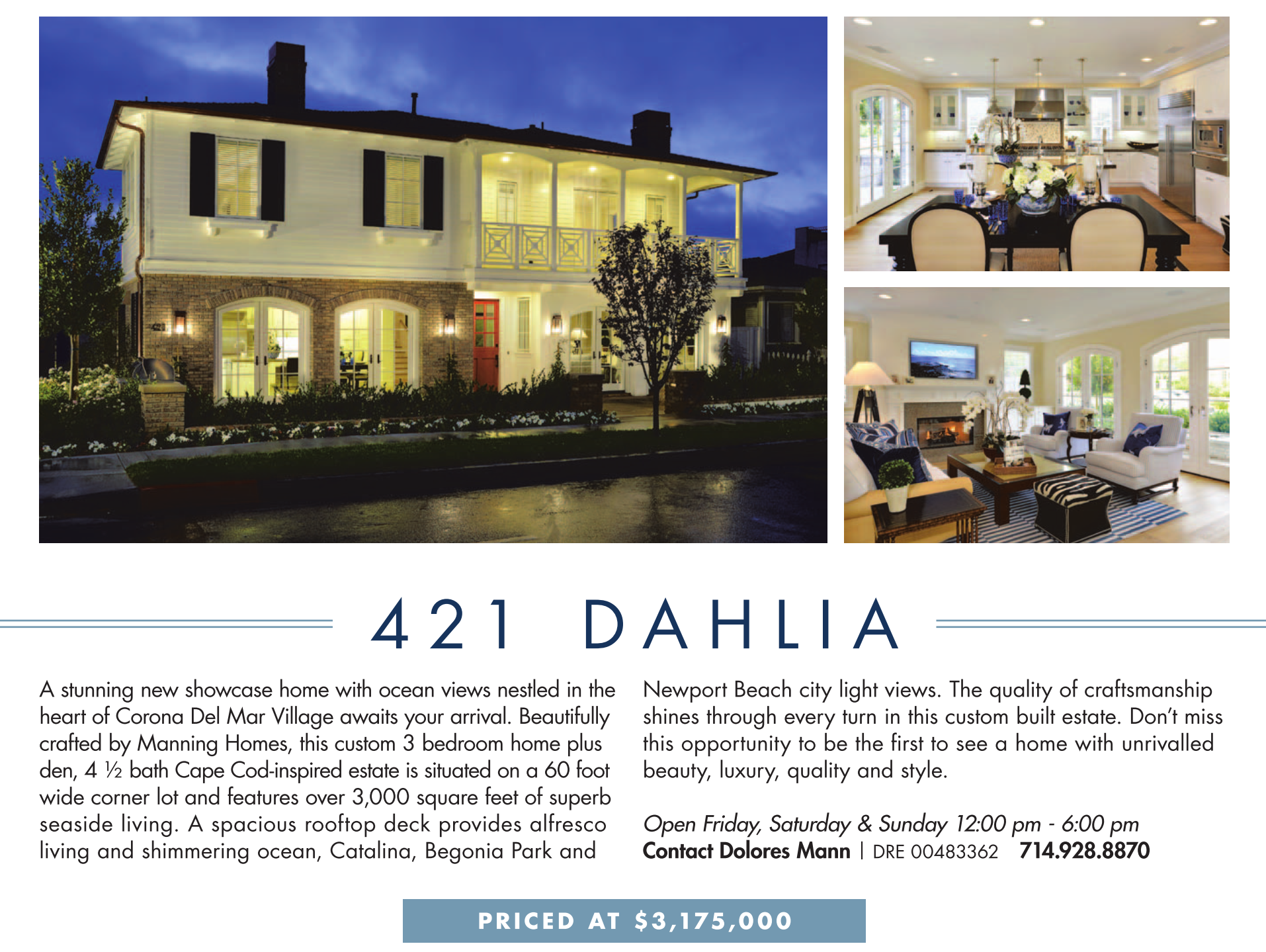 4 2 1 D A H L I A A stunning new showcase home with ocean views nestled in the heart of Corona Del Mar Village awaits your arrival. Beautifully crafted by Manning Homes, this custom 3 bedroom home plus den, 4 ½ bath Cape Cod-inspired estate is situated on a 60 foot wide corner lot and features over 3,000 square feet of superb seaside living. A spacious rooftop deck provides alfresco living and shimmering ocean, Catalina, Begonia Park and Newport Beach city light views. The quality of craftsmanship shines through every turn in this custom built estate. Don’t miss this opportunity to be the first to see a home with unrivalled beauty, luxury, quality and style. Open Friday, Saturday & Sunday 12:00 pm - 6:00 pm Contact Dolores Mann | DRE 00483362 714.928.8870 PRICED AT $3,175,000
