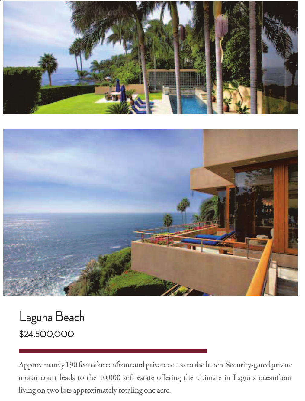Laguna Beach $24,500,000 Approximately 190 feet of oceanfront and private access to the beach. Security-gated private motor court leads to the 10,000 sqft estate offering the ultimate in Laguna oceanfront living on two lots approximately totaling one acre.