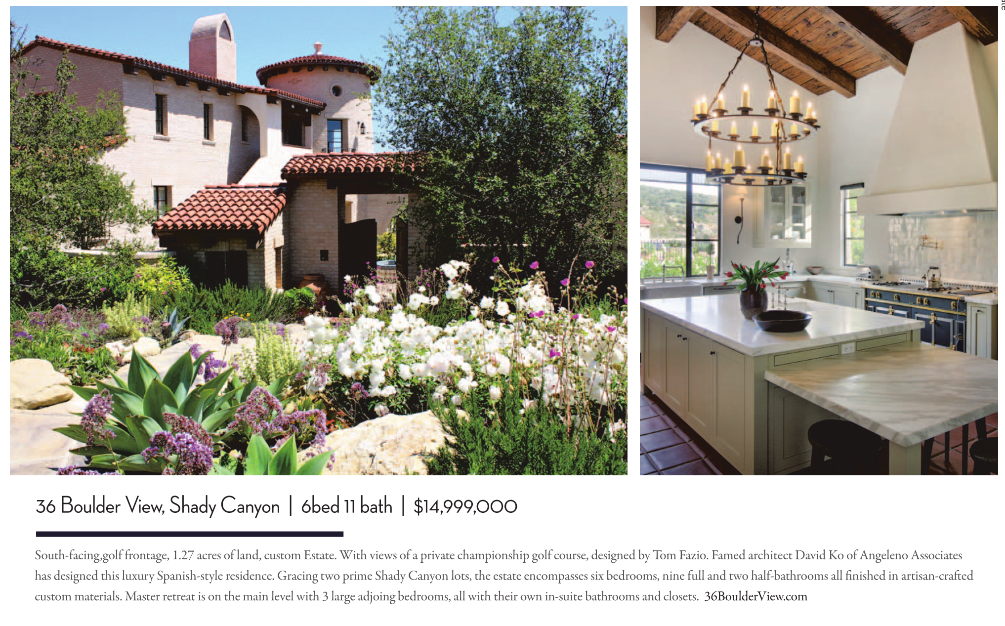 36 Boulder View, Shady Canyon | 6bed 11 bath | $14,999,000 South-facing,golf frontage, 1.27 acres of land, custom Estate. With views of a private championship golf course, designed by Tom Fazio. Famed architect David Ko of Angeleno Associates has designed this luxury Spanish-style residence. Gracing two prime Shady Canyon lots, the estate encompasses six bedrooms, nine full and two half-bathrooms all finished in artisan-crafted custom materials. Master retreat is on the main level with 3 large adjoing bedrooms, all with their own in-suite bathrooms and closets. 36BoulderView.com