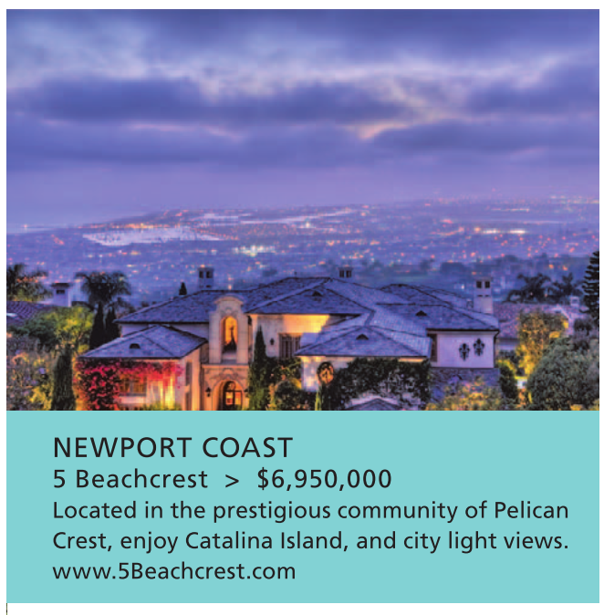 NEWPORT COAST 5 Beachcrest > $6,950,000 Located in the prestigious community of Pelican Crest, enjoy Catalina Island, and city light views. www.5Beachcrest.com