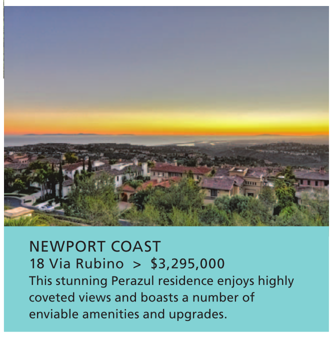 NEWPORT COAST 18 Via Rubino > $3,295,000 This stunning Perazul residence enjoys highly coveted views and boasts a number of enviable amenities and upgrades.