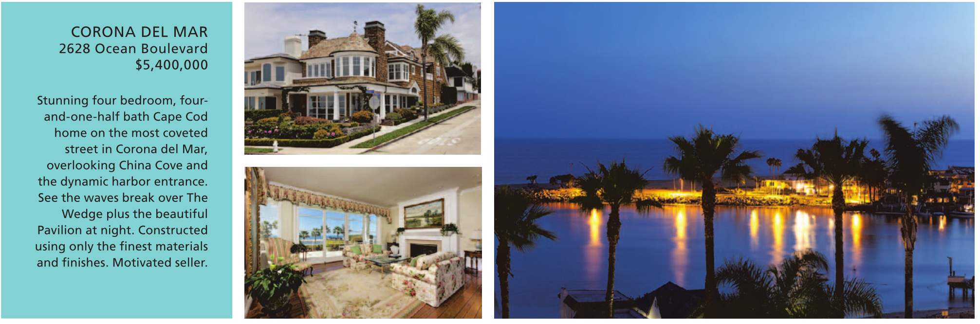 CORONA DEL MAR 2628 Ocean Boulevard $5,400,000 Stunning four bedroom, fourand-one-half bath Cape Cod home on the most coveted street in Corona del Mar, overlooking China Cove and the dynamic harbor entrance. See the waves break over The Wedge plus the beautiful Pavilion at night. Constructed using only the finest materials and finishes. Motivated seller.