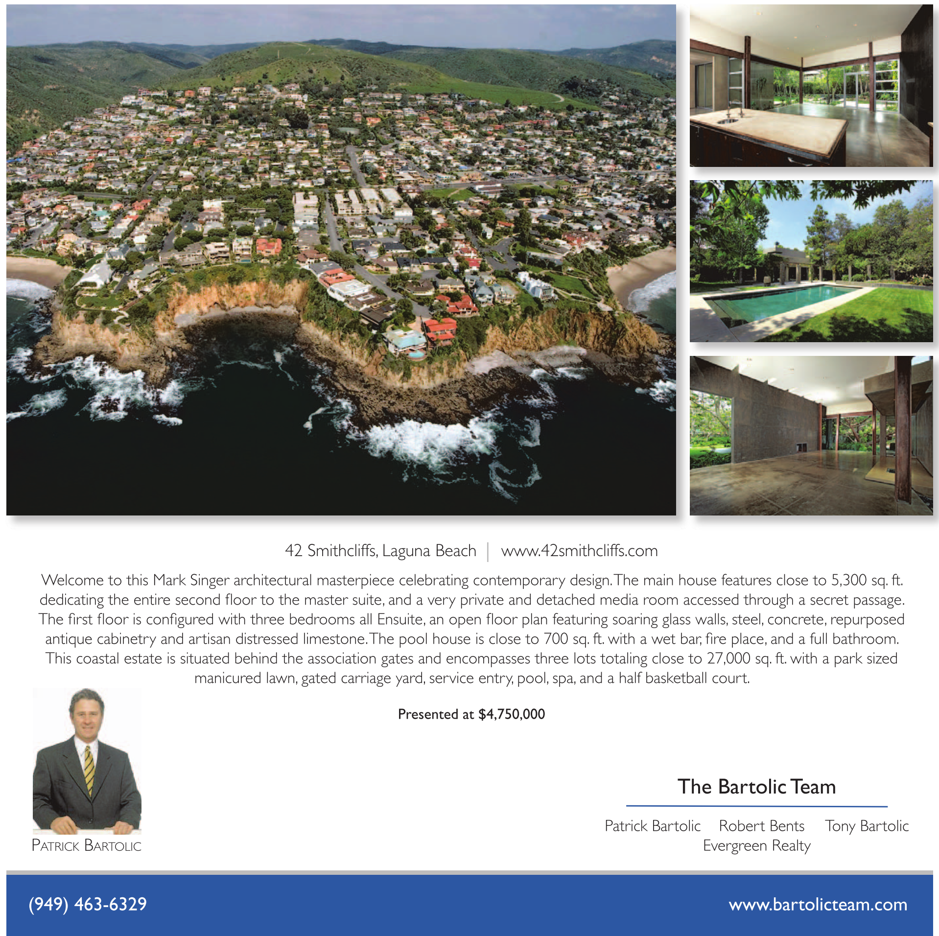 42 Smithcliffs, Laguna Beach www.42smithcliffs.com Welcome to this Mark Singer architectural masterpiece celebrating contemporary design.The main house features close to 5,300 sq. ft. dedicating the entire second floor to the master suite, and a very private and detached media room accessed through a secret passage. The first floor is configured with three bedrooms all Ensuite, an open floor plan featuring soaring glass walls, steel, concrete, repurposed antique cabinetry and artisan distressed limestone.The pool house is close to 700 sq. ft. with a wet bar, fire place, and a full bathroom. This coastal estate is situated behind the association gates and encompasses three lots totaling close to 27,000 sq. ft. with a park sized manicured lawn, gated carriage yard, service entry, pool, spa, and a half basketball court. Presented at $4,750,000 The Bartolic Team PATRICK BARTOLIC Patrick Bartolic Robert Bents Tony Bartolic Evergreen Realty (949) 463-6329 www.bartolicteam.com