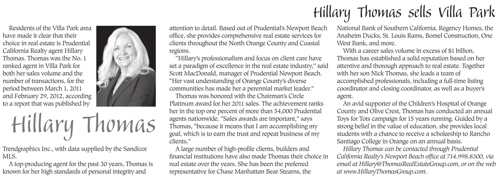 Residents of the Villa Park area have made it clear that their choice in real estate is Prudential California Realty agent Hillary Thomas. Thomas was the No. 1 ranked agent in Villa Park for both her sales volume and the number of transactions, for the period between March 1, 2011 and February 29, 2012, according