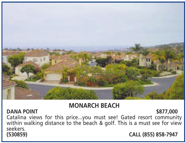 MONARCH BEACH DANA POINT $877,000 Catalina views for this price...you must see! Gated resort community within walking distance to the beach & golf. This is a must see for view seekers. (530859) CALL (855) 858-7947