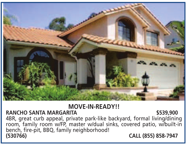 MOVE-IN-READY!! RANCHO SANTA MARGARITA $539,900 4BR, great curb appeal, private park-like backyard, formal living/dining room, family room w/FP, master w/dual sinks, covered patio, w/built-in bench, fire-pit, BBQ, family neighborhood! (530766) CALL (855) 858-7947