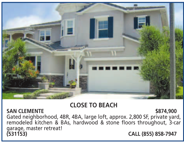 CLOSE TO BEACH SAN CLEMENTE $874,900 Gated neighborhood, 4BR, 4BA, large loft, approx. 2,800 SF, private yard, remodeled kitchen & BAs, hardwood & stone floors throughout, 3-car garage, master retreat! (531153) CALL (855) 858-7947