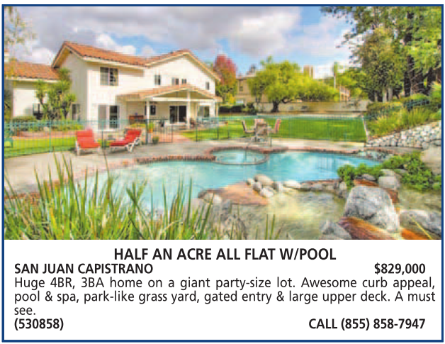 HALF AN ACRE ALL FLAT W/POOL SAN JUAN CAPISTRANO $829,000 Huge 4BR, 3BA home on a giant party-size lot. Awesome curb appeal, pool & spa, park-like grass yard, gated entry & large upper deck. A must see. (530858) CALL (855) 858-7947