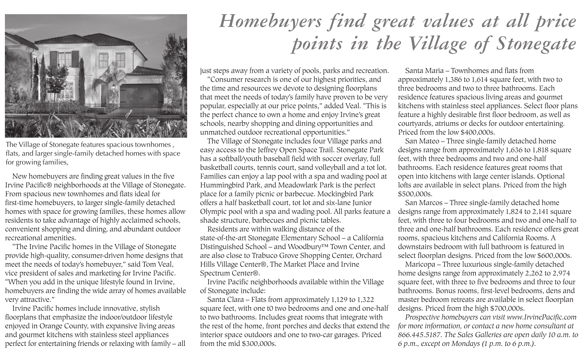 “The Irvine Pacific homes in the Village of Stonegate provide high-quality, consumer-driven home designs that meet the needs of today’s homebuyer,” said Tom Veal, vice president of sales and marketing for Irvine Pacific. “When you add in the unique lifestyle found in Irvine, homebuyers are finding the wide array of homes available very attractive.”