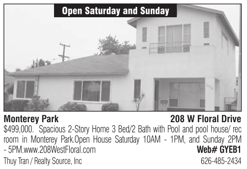 $499,000. Spacious 2-Story Home 3 Bed/2 Bath with Pool and pool house/ rec room in Monterey Park.Open House Saturday 10AM - 1PM, and Sunday 2PM - 5PM.www.208WestFloral.com Web# GYEB1 Thuy Tran / Realty Source, Inc 626-485-2434