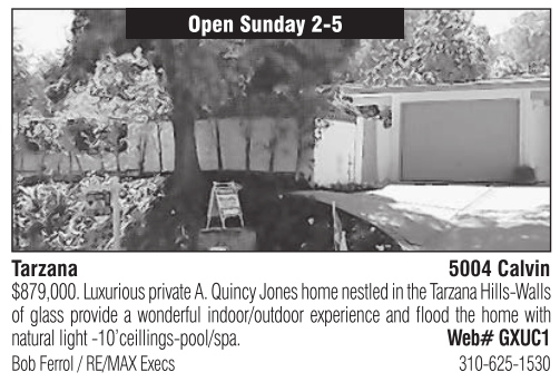 Tarzana 5004 Calvin $879,000. Luxurious private A. Quincy Jones home nestled in the Tarzana Hills-Walls of glass provide a wonderful indoor/outdoor experience and flood the home with natural light -10’ceillings-pool/spa. Web# GXUC1