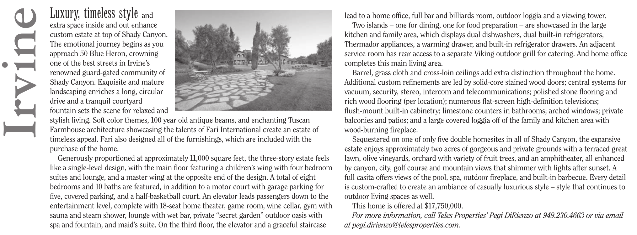This home is offered at $17,750,000. For more information, call Teles Properties’ Pegi DiRienzo at 949.230.4663 or via email at pegi.dirienzo@telesproperties.com.