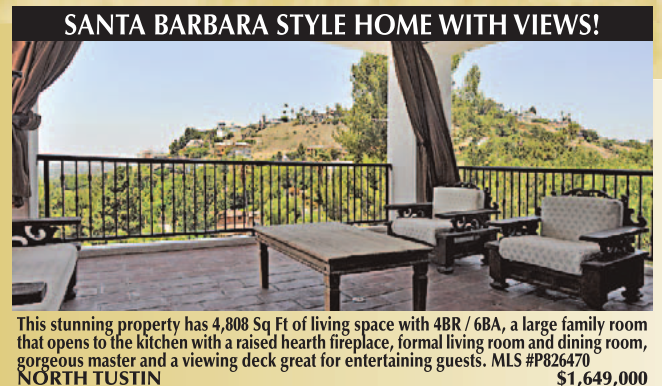 SANTA BARBARA STYLE HOME WITH VIEWS! This stunning property has 4,808 Sq Ft of living space with 4BR / 6BA, a large family room that opens to the kitchen with a raised hearth fireplace, formal living room and dining room, gorgeous master and a viewing deck great for entertaining guests. MLS #P826470 NORTH TUSTIN $1,649,000