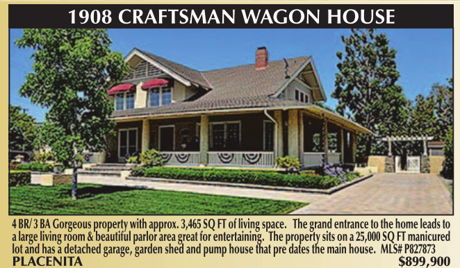 1908 CRAFTSMAN WAGON HOUSE 4 BR/ 3 BA Gorgeous property with approx. 3,465 SQ FT of living space. The grand entrance to the home leads to a large living room & beautiful parlor area great for entertaining. The property sits on a 25,000 SQ FT manicured lot and has a detached garage, garden shed and pump house that pre dates the main house. MLS# P827873 PLACENITA $899,900