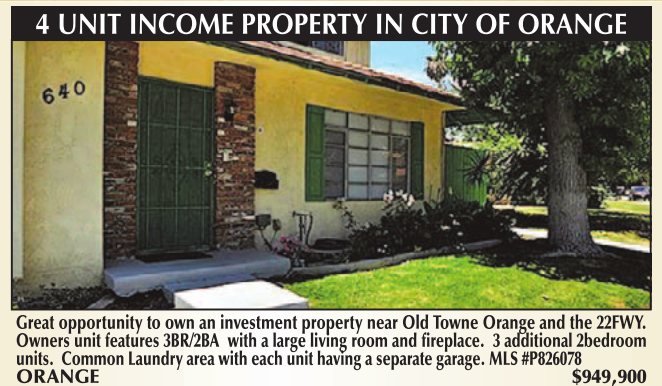 Great opportunity to own an investment property near Old Towne Orange and the 22FWY. Owners unit features 3BR/2BA with a large living room and fireplace. 3 additional 2bedroom units. Common Laundry area with each unit having a separate garage. MLS #P826078 ORANGE $949,900