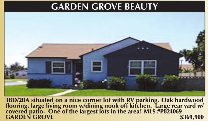 3BD/2BA situated on a nice corner lot with RV parking. Oak hardwood flooring, large living room w/dining nook off kitchen. Large rear yard w/ covered patio. One of the largest lots in the area! MLS #P824069 GARDEN GROVE $369,900