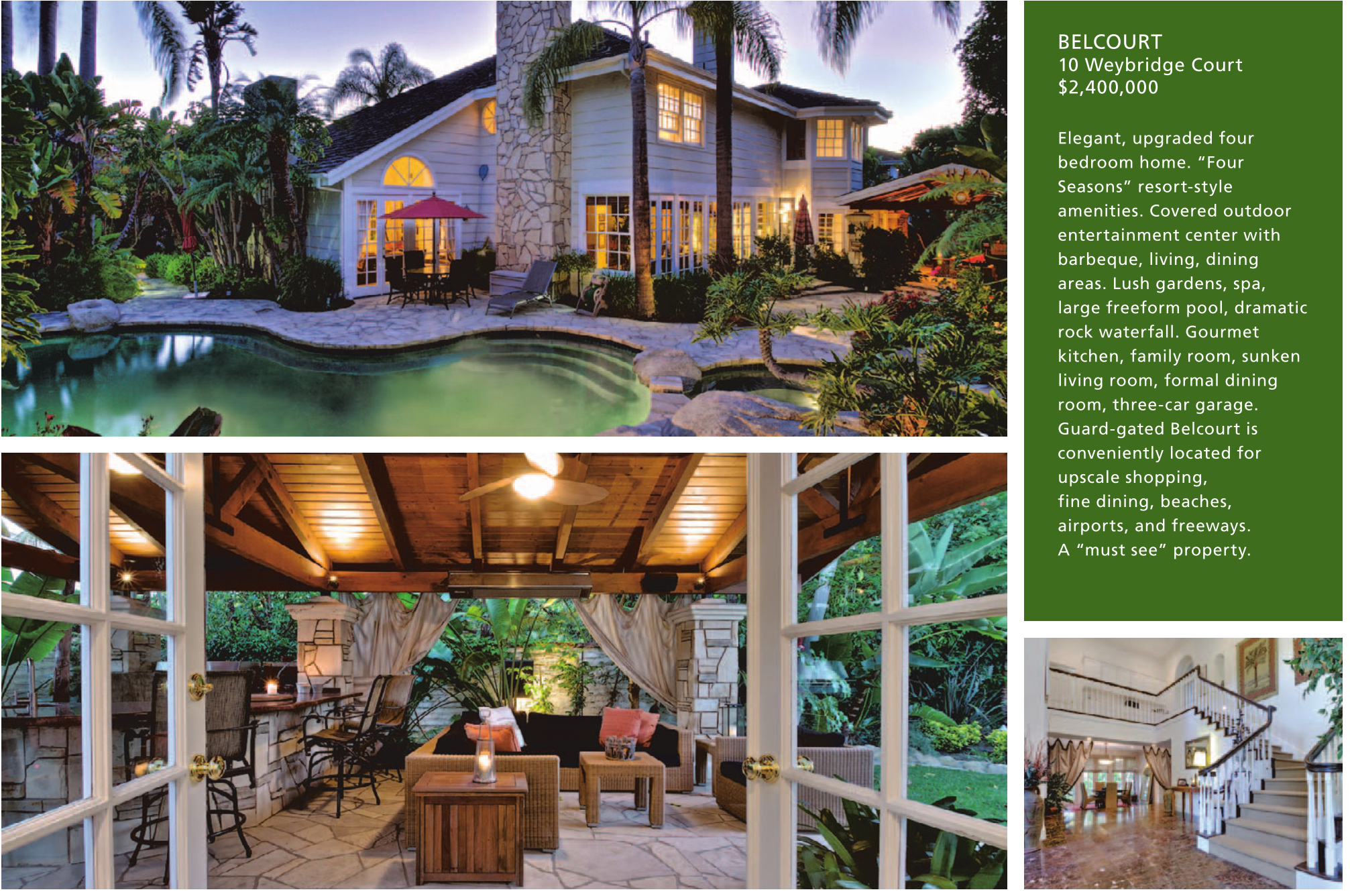 BELCOURT 10 Weybridge Court $2,400,000 Elegant, upgraded four bedroom home. “Four Seasons” resort-style amenities. Covered outdoor entertainment center with barbeque, living, dining areas. Lush gardens, spa, large freeform pool, dramatic rock waterfall. Gourmet kitchen, family room, sunken living room, formal dining room, three-car garage. Guard-gated Belcourt is conveniently located for upscale shopping, fine dining, beaches, airports, and freeways. A “must see” property.
