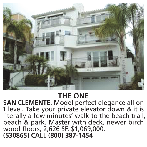 THE ONE SAN CLEMENTE. Model perfect elegance all on 1 level. Take your private elevator down & it is literally a few minutes’ walk to the beach trail, beach & park. Master with deck, newer birch wood floors, 2,626 SF. $1,069,000. (530865) CALL (800) 387-1454