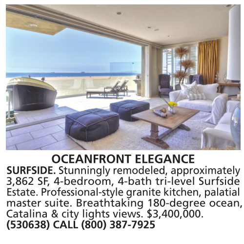 OCEANFRONT ELEGANCE SURFSIDE. Stunningly remodeled, approximately 3,862 SF, 4-bedroom, 4-bath tri-level Surfside Estate. Professional-style granite kitchen, palatial master suite. Breathtaking 180-degree ocean, Catalina & city lights views. $3,400,000. (530638) CALL (800) 387-7925
