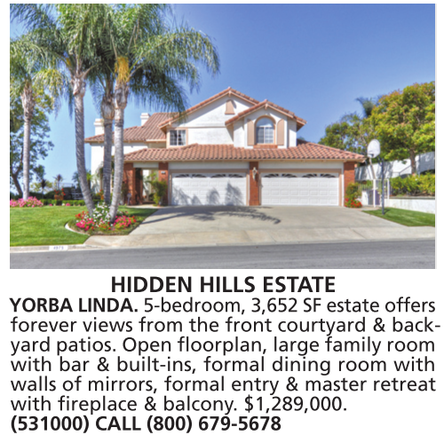 HIDDEN HILLS ESTATE YORBA LINDA. 5-bedroom, 3,652 SF estate offers forever views from the front courtyard & backyard patios. Open floorplan, large family room with bar & built-ins, formal dining room with walls of mirrors, formal entry & master retreat with fireplace & balcony. $1,289,000. (531000) CALL (800) 679-5678