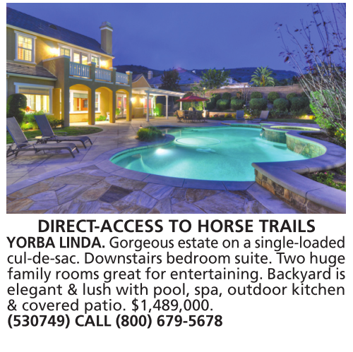 DIRECT-ACCESS TO HORSE TRAILS YORBA LINDA. Gorgeous estate on a single-loaded cul-de-sac. Downstairs bedroom suite. Two huge family rooms great for entertaining. Backyard is elegant & lush with pool, spa, outdoor kitchen & covered patio. $1,489,000. (530749) CALL (800) 679-5678