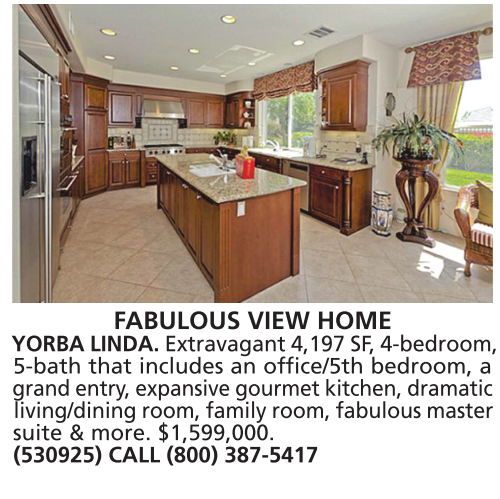 FABULOUS VIEW HOME YORBA LINDA. Extravagant 4,197 SF, 4-bedroom, 5-bath that includes an office/5th bedroom, a grand entry, expansive gourmet kitchen, dramatic living/dining room, family room, fabulous master suite & more. $1,599,000. (530925) CALL (800) 387-5417