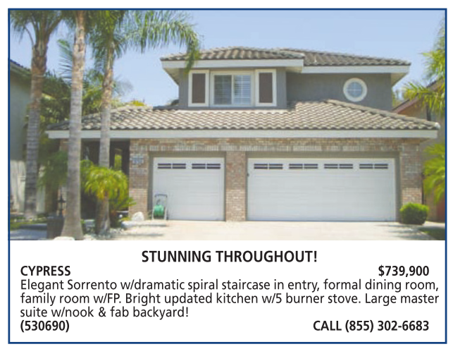 CYPRESS $739,900 Elegant Sorrento w/dramatic spiral staircase in entry, formal dining room, family room w/FP. Bright updated kitchen w/5 burner stove. Large master suite w/nook & fab backyard! (530690) CALL (855) 302-6683