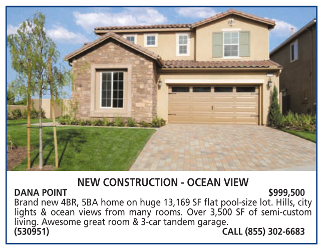 NEW CONSTRUCTION - OCEAN VIEW DANA POINT $999,500 Brand new 4BR, 5BA home on huge 13,169 SF flat pool-size lot. Hills, city lights & ocean views from many rooms. Over 3,500 SF of semi-custom living. Awesome great room & 3-car tandem garage. (530951) CALL (855) 302-6683