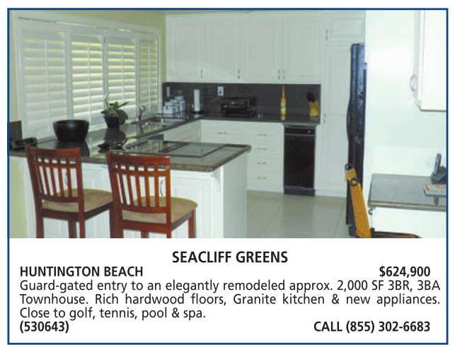 SEACLIFF GREENS HUNTINGTON BEACH $624,900 Guard-gated entry to an elegantly remodeled approx. 2,000 SF 3BR, 3BA Townhouse. Rich hardwood floors, Granite kitchen & new appliances. Close to golf, tennis, pool & spa. (530643) CALL (855) 302-6683