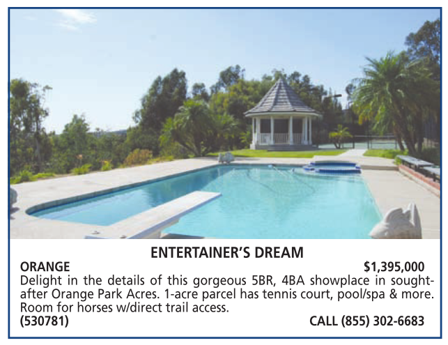 ENTERTAINER’S DREAM ORANGE $1,395,000 Delight in the details of this gorgeous 5BR, 4BA showplace in soughtafter Orange Park Acres. 1-acre parcel has tennis court, pool/spa & more.