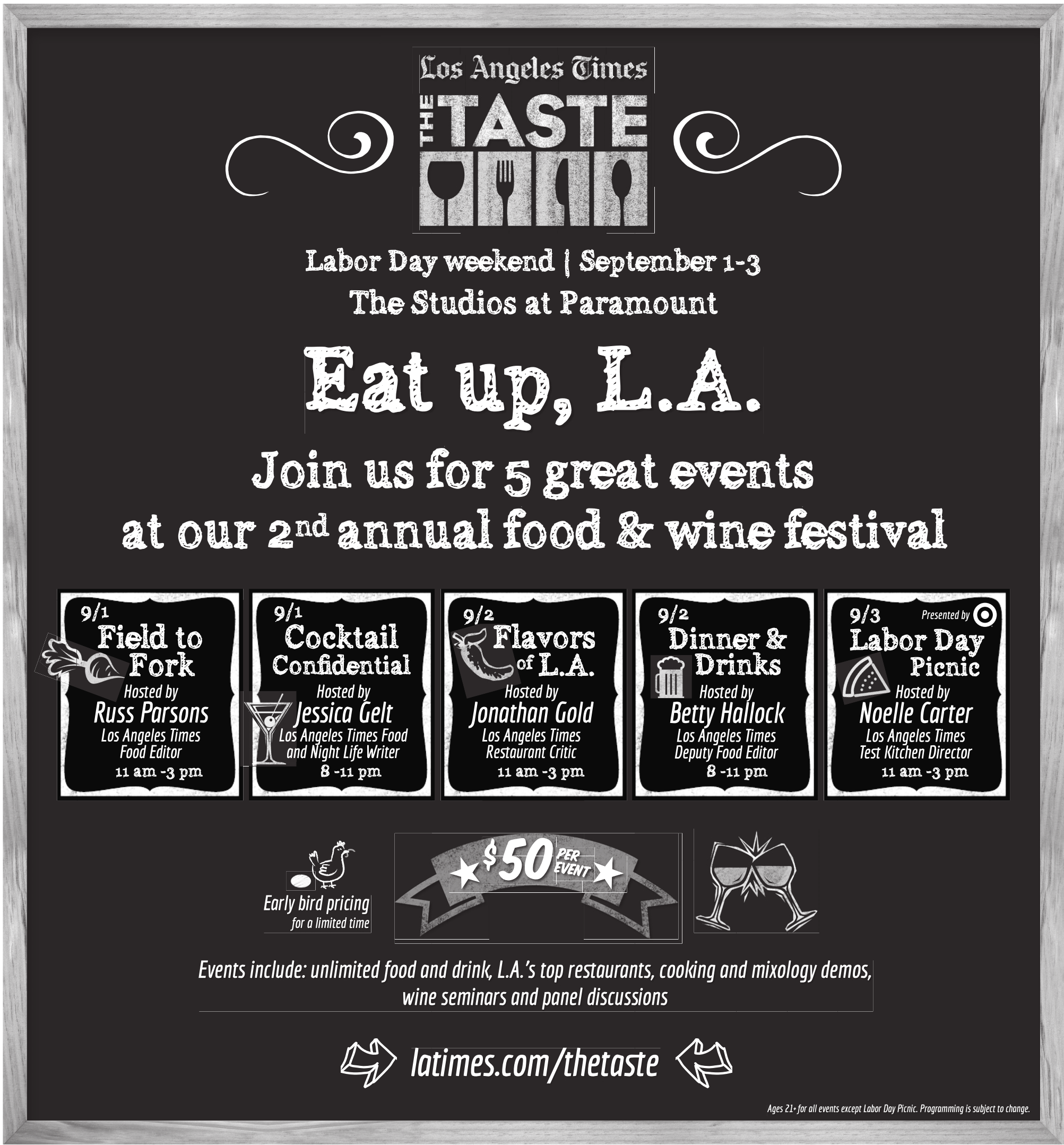 Events include: unlimited food and drink, L.A.’s top restaurants, cooking and mixology demos, wine seminars and panel discussions