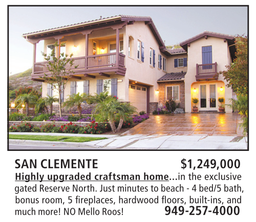SAN CLEMENTE $1,249,000 Highly upgraded craftsman home...in the exclusive gated Reserve North. Just minutes to beach - 4 bed/5 bath, bonus room, 5 fi replaces, hardwood fl oors, built-ins, and much more! NO Mello Roos! 949-257-4000