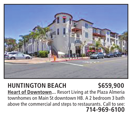 HUNTINGTON BEACH $659,900 Heart of Downtown... Resort Living at the Plaza Almeria townhomes on Main St downtown HB. A 2 bedroom 3 bath above the commercial and steps to restaurants. Call to see: