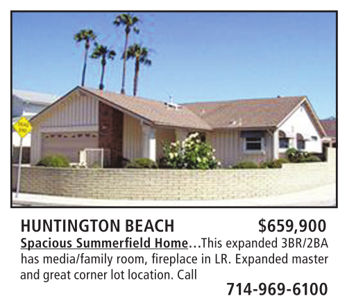 HUNTINGTON BEACH $659,900 Spacious Summerfield Home…This expanded 3BR/2BA has media/family room, fi replace in LR. Expanded master and great corner lot location. Call 714-969-6100