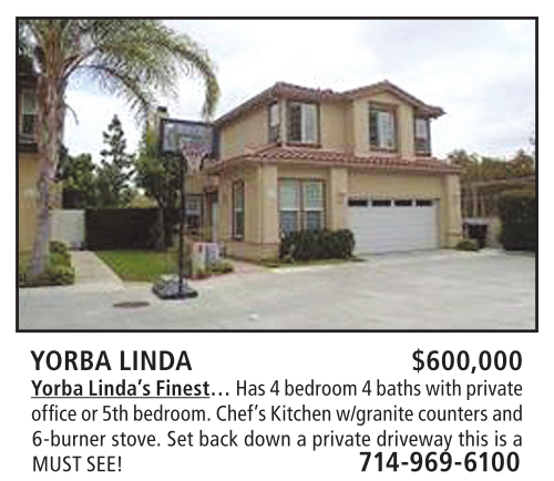 YORBA LINDA $600,000 Yorba Linda’s Finest… Has 4 bedroom 4 baths with private office or 5th bedroom. Chef’s Kitchen w/granite counters and 6-burner stove. Set back down a private driveway this is a MUST SEE! 714-969-6100