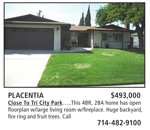 PLACENTIA $493,000 Close To Tri City Park…..This 4BR, 2BA home has open fl oorplan w/large living room w/fi replace. Huge backyard, fire ring and fruit trees. Call 714-482-9100