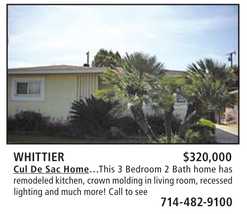 WHITTIER $320,000 Cul De Sac Home…This 3 Bedroom 2 Bath home has remodeled kitchen, crown molding in living room, recessed lighting and much more! Call to see 714-482-9100