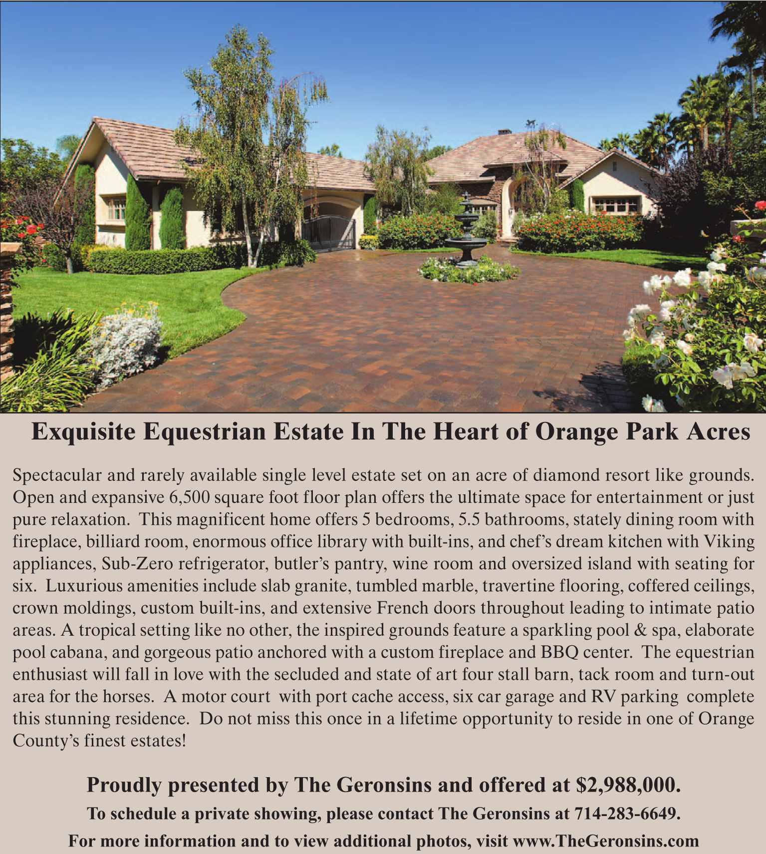 Exquisite Equestrian Estate In The Heart of Orange Park Acres Spectacular and rarely available single level estate set on an acre of diamond resort like grounds. Open and expansive 6,500 square foot floor plan offers the ultimate space for entertainment or just pure relaxation. This magnificent home offers 5 bedrooms, 5.5 bathrooms, stately dining room with fireplace, billiard room, enormous office library with built-ins, and chef’s dream kitchen with Viking appliances, Sub-Zero refrigerator, butler’s pantry, wine room and oversized island with seating for six. Luxurious amenities include slab granite, tumbled marble, travertine flooring, coffered ceilings, crown moldings, custom built-ins, and extensive French doors throughout leading to intimate patio areas. A tropical setting like no other, the inspired grounds feature a sparkling pool & spa, elaborate pool cabana, and gorgeous patio anchored with a custom fireplace and BBQ center. The equestrian enthusiast will fall in love with the secluded and state of art four stall barn, tack room and turn-out area for the horses. A motor court with port cache access, six car garage and RV parking complete this stunning residence. Do not miss this once in a lifetime opportunity to reside in one of Orange County’s finest estates! Proudly presented by The Geronsins and offered at $2,988,000. To schedule a private showing, please contact The Geronsins at 714-283-6649. For more information and to view additional photos, visit www.TheGeronsins.com
