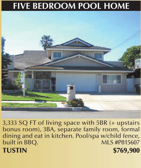 3,333 SQ FT of living space with 5BR (+ upstairs bonus room), 3BA, separate family room, formal dining and eat in kitchen. Pool/spa w/child fence, built in BBQ. MLS #P815607 TUSTIN $769,900