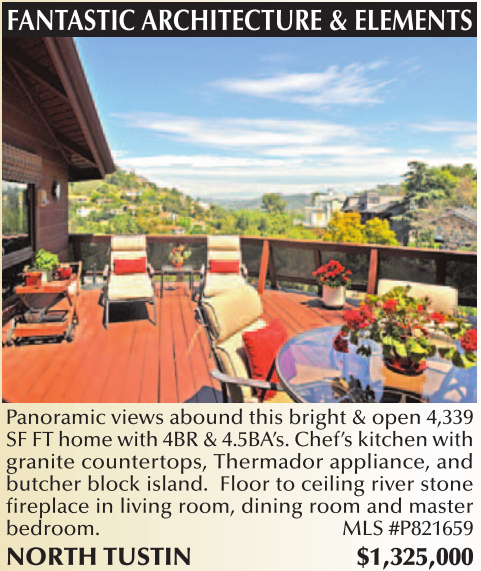 Panoramic views abound this bright & open 4,339 SF FT home with 4BR & 4.5BA’s. Chef’s kitchen with granite countertops, Thermador appliance, and butcher block island. Floor to ceiling river stone fireplace in living room, dining room and master bedroom. MLS #P821659 NORTH TUSTIN $1,325,000