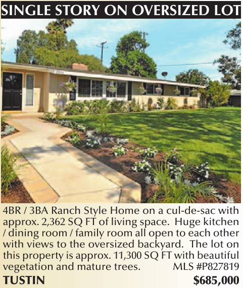 SINGLE STORY ON OVERSIZED LOT 4BR / 3BA Ranch Style Home on a cul-de-sac with approx. 2,362 SQ FT of living space. Huge kitchen / dining room / family room all open to each other with views to the oversized backyard. The lot on this property is approx. 11,300 SQ FT with beautiful vegetation and mature trees. MLS #P827819 TUSTIN $685,000